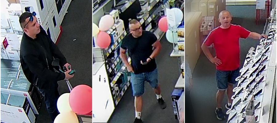 Widoczni na zdjęciach mężczyźni, działając razem na terenie jednego z mławskich sklepów RTV/AGD, ukradli dwa smartwatche. Jeśli rozpoznajesz złodziei, powiadom Policję.