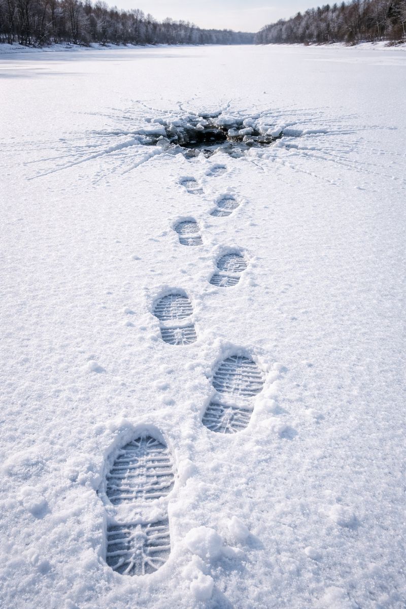 Nawet jeśli lód wydaje się gruby, równy i stabilny, nie masz żadnej pewności, co dzieje się pod powierzchnią. Wystarczy jeden krok w złym miejscu, by tafla pękła, a Ty znajdziesz się w lodowatej wodzie. To realne zagrożenie życia.