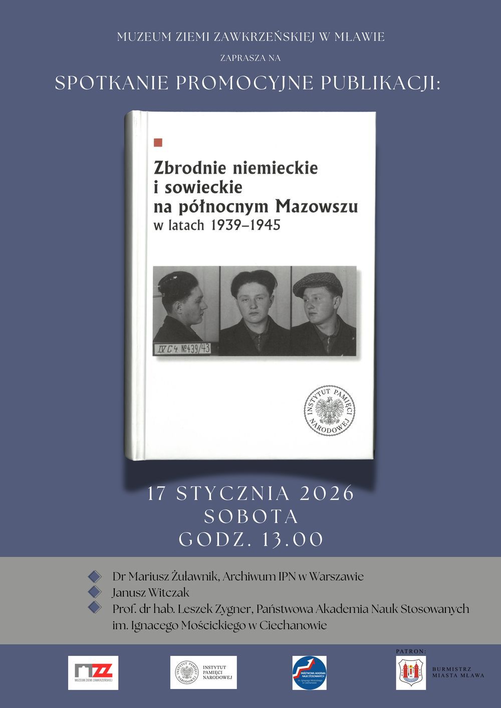 W sobotę, 17 stycznia 2026 roku, w Muzeum Ziemi Zawkrzeńskiej w Mławie odbędzie się spotkanie promocyjne publikacji poświęconej zbrodniom niemieckim i sowieckim dokonanym na północnym Mazowszu w latach II wojny światowej.