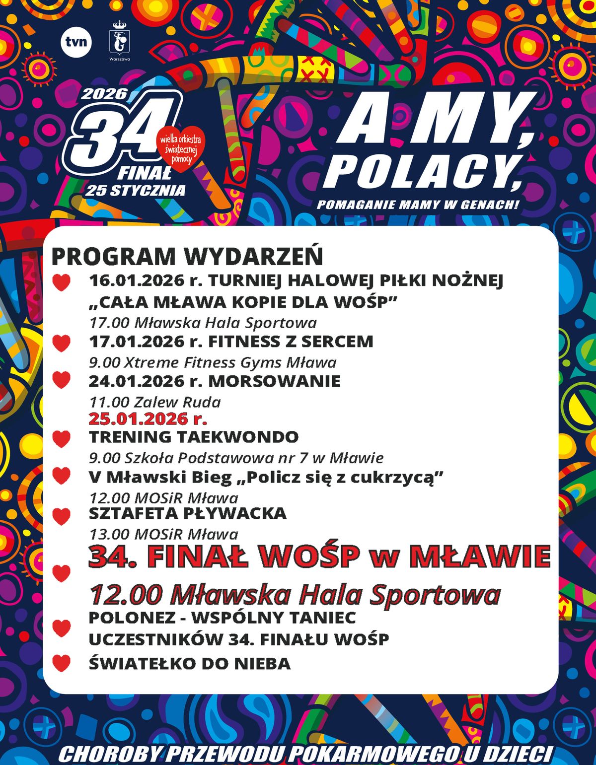 34. Finał WOŚP odbędzie się 25 stycznia 2026 roku (niedziela) w Mławskiej Hali Sportowej przy Alei Piłsudskiego 33a. To wyjątkowe wydarzenie po raz kolejny stanie się imprezą ogólnomiejską, a cały dochód ze zbiórki zostanie przeznaczony na diagnozowanie, monitorowanie i leczenie chorób układu pokarmowego u dzieci. Dzięki zgromadzonym środkom Fundacja będzie mogła pomóc placówkom medycznym w całej Polsce, zapewniając jeszcze lepszą opiekę dla małych pacjentów.
