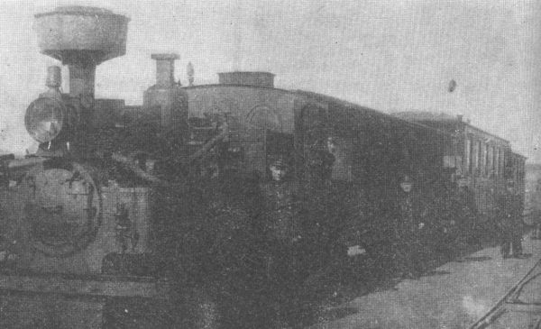 Wólczańscy kolejarze przy składzie pociągu na stacji Wólka, okres międzywojenny