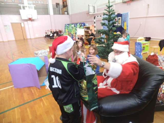 Na początku spotkania uczniowie z klasy Va, pod kierunkiem p. D. Kieglerskiego, p. N. Maciak i p. A. Wysockiej przedstawili inscenizację pt. „Ratujmy Święta”, a szkolny chór zaśpiewał piosenki o Mikołaju. Przedstawienie było bardzo ciekawe i zawierało cele wychowawcze. Po głośnych okrzykach: ”Mikołaju, Mikołaju” zjawił się gość. Jednak wszyscy byli zaskoczeni, gdy okazało się, że Mikołaj jedzie na rowerze z workiem prezentów. Gdy zszedł z roweru zasiadł w fotelu. Po krótkim odpoczynku wręczył każdej klasie prezenty, które przekazał na ręce przewodniczących klas. Po wręczeniu upominków Mikołaj wsiadł na rower i odjechał. Wszyscy odprowadzili gościa wzrokiem. Trzeba przyznać, że dobrze jeździ na rowerze!!!