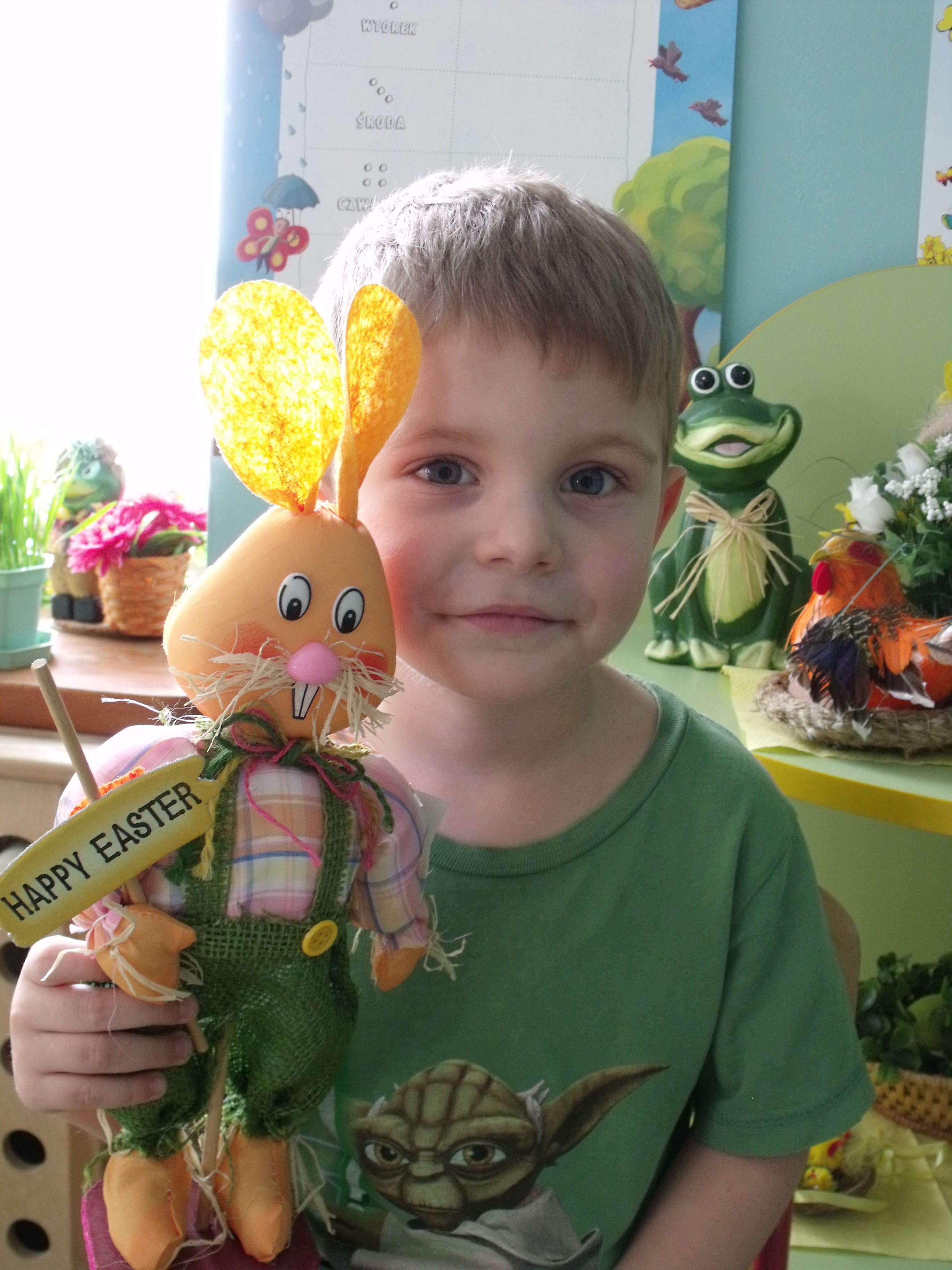 Łukasz Gabrielski Wielkanocne życzenia zdróweczka, kolorowych pisanek w dużym koszyku z kościoła i największego na świecie zajączka wysyłam mamie, tacie, dziadkom i ciociom z przedszkola.