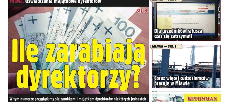 W tym numerze przyglądamy się zarobkom i majątkom dyrektorów niektórych jednostek podległych mławskiemu ratuszowi. Pod lupę bierzemy oświadczenia majątkowe za 2016 r. szefów: Miejskiego Ośrodka Pomocy Społecznej, Miejskiego Ośrodka Sportu i Rekreacji, Miejskiej Biblioteki Publicznej, Miejskiego Domu Kultury i Muzeum Ziemi Zawkrzeńskiej.