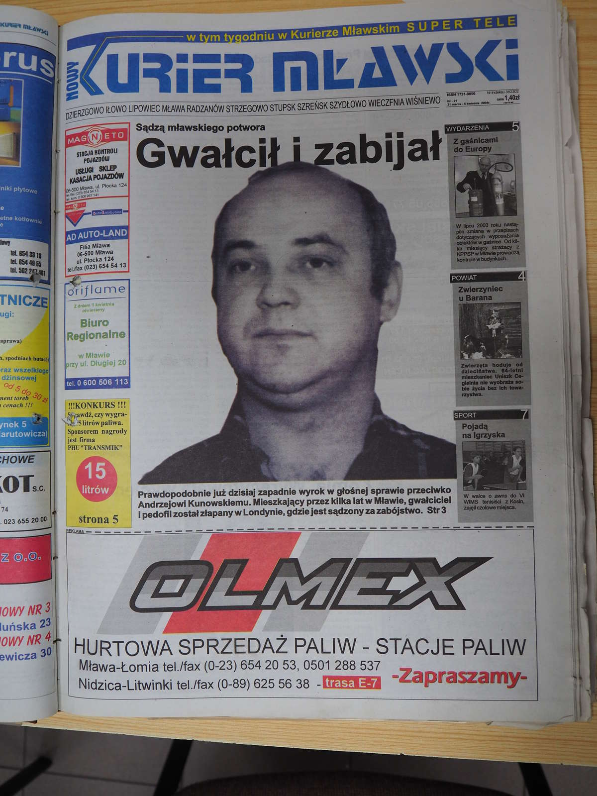 Rok 2004 - Sądzą mławskiego potwora. Gwałcił i zabijał: W mławskim sądzie odbył się proces Andrzeja Kunkowskiego gwałciciela, pedofila i mordercy, który wpadł w ręce wymiaru sprawiedliwości na Wyspach Brytyjskich. Bestia z Mławy sądzona była w miejscowym sądzie o alimenty. Zatrzymany i skazany Kunowski zmarł w więzieniu, jednak jego postać nadal budzi strach i przerażenie.