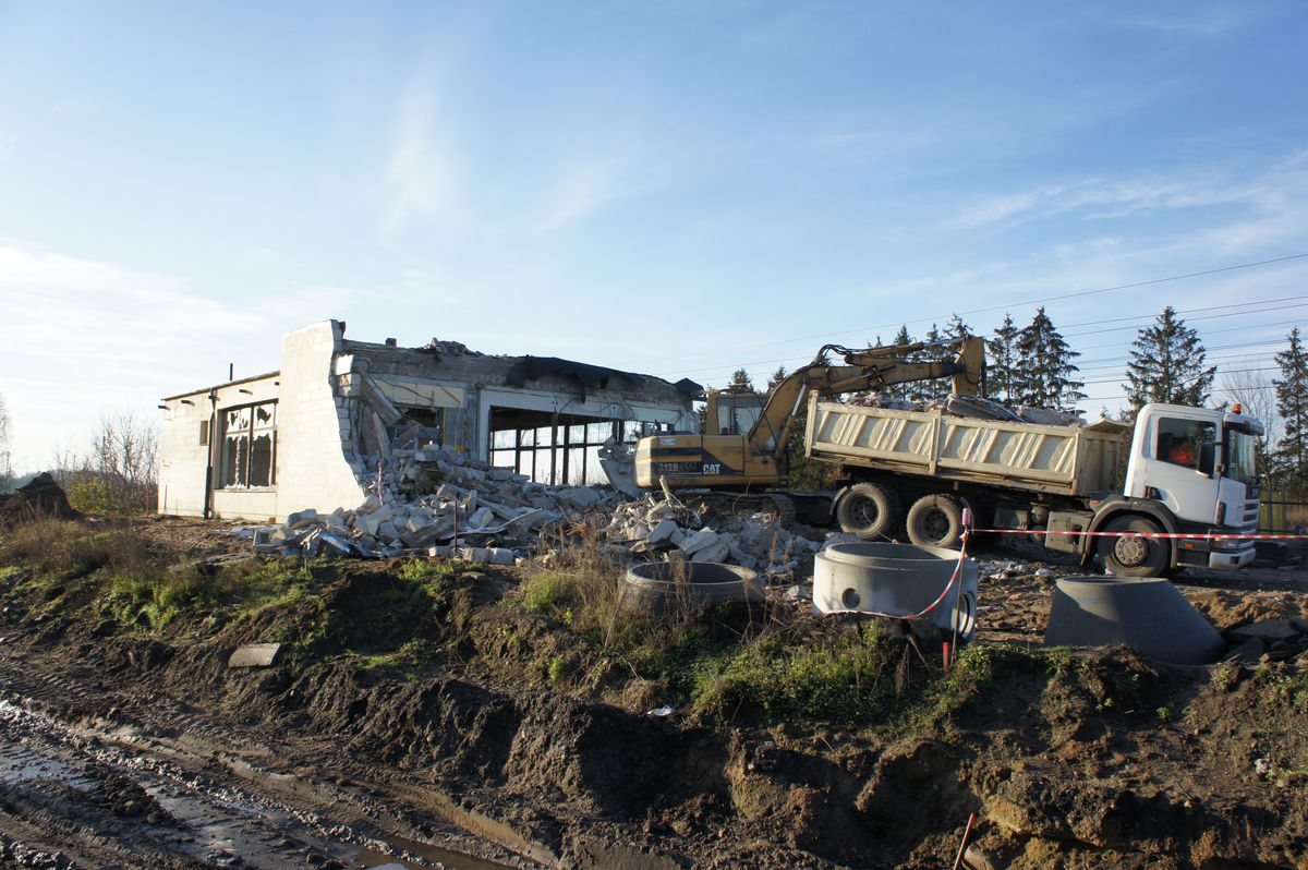 Trwają prace rozbiórkowe budynku dawnego dworca Mława Miasto. Wkrótce jego funkcje przejmie budowany w sąsiedztwie dworzec zintegrowany.